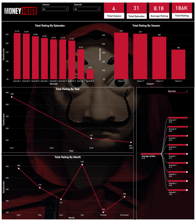 Interactive Dashboards designed on Power BI to analyse the movie Money Heist with data for just 4 Seasons been used to create the report on how viewers rates the movie